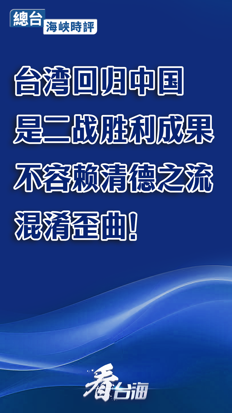 近日,赖清德在“欧战胜利80周年”纪念活动上刻意强调“欧战胜利”,忽略亚洲战场抗战胜利,歪曲二战历史,被岛内舆论批评为“充斥‘台独史观’”。众所周知,台湾回归中国是二战胜利成果,对全体中华儿女来说意义重大,不容赖清德之流混淆歪曲!